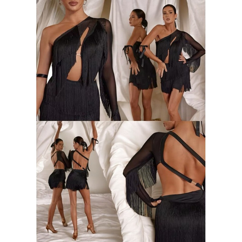 Design Elegante e Raffinato: L'abito nero è caratterizzato da un design aderente che esalta la figura, con dettagli in frangia che aggiungono movimento e drammaticità a ogni passo di danza. La combinazione di stile classico e dettagli moderni rende questo abito unico nel suo genere.