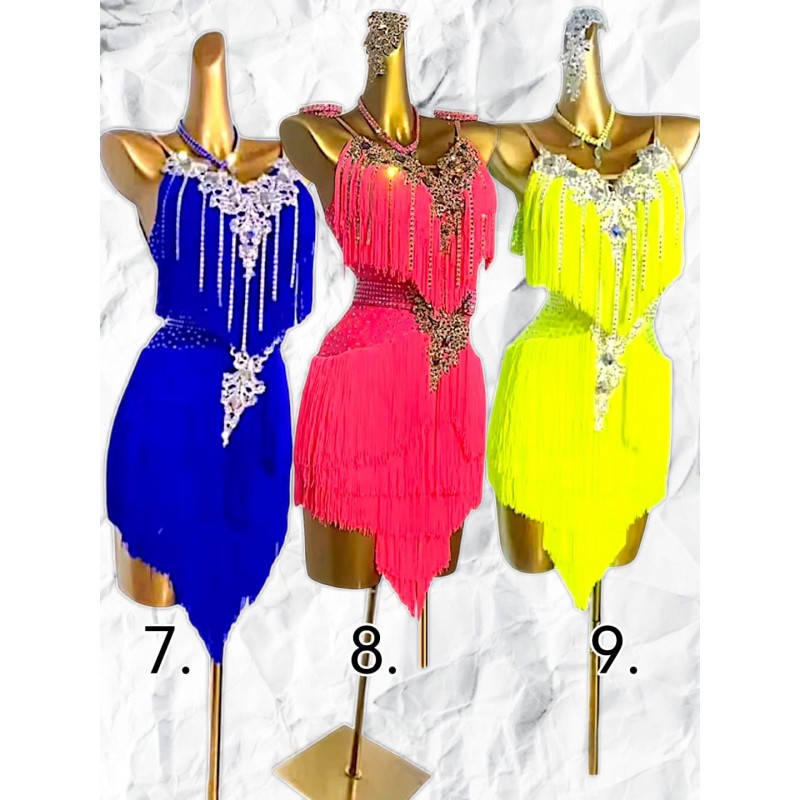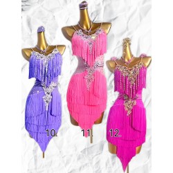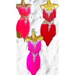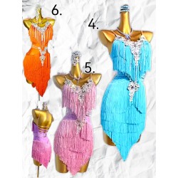 Immagina un abito da ballo mozzafiato realizzato in tessuto lussuoso in un colore audace come rosso scuro, nero o blu notte. L'abito presenta un corpetto elegante e aderente decorato con strass scintillanti, che catturano e riflettono la luce mentre la ballerina si muove. La gonna è il pezzo forte: uno strato a cascata di frange che ondeggiano a ogni movimento, ogni frangia ricoperta di strass scintillanti che aggiungono ulteriore glamour e lucentezza.i